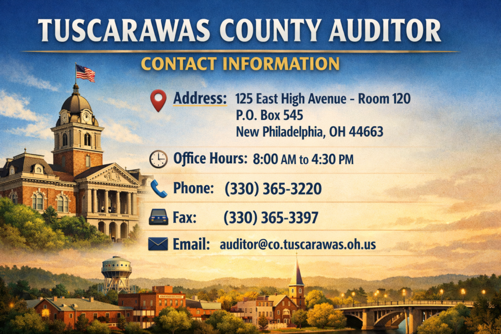 The Tuscarawas County Auditor is responsible for maintaining accurate property records, assessing property values, and managing tax-related information for the county. This office ensures transparency, fairness, and accountability in property assessments, financial reporting, and public records, helping residents, businesses, and investors make informed decisions.